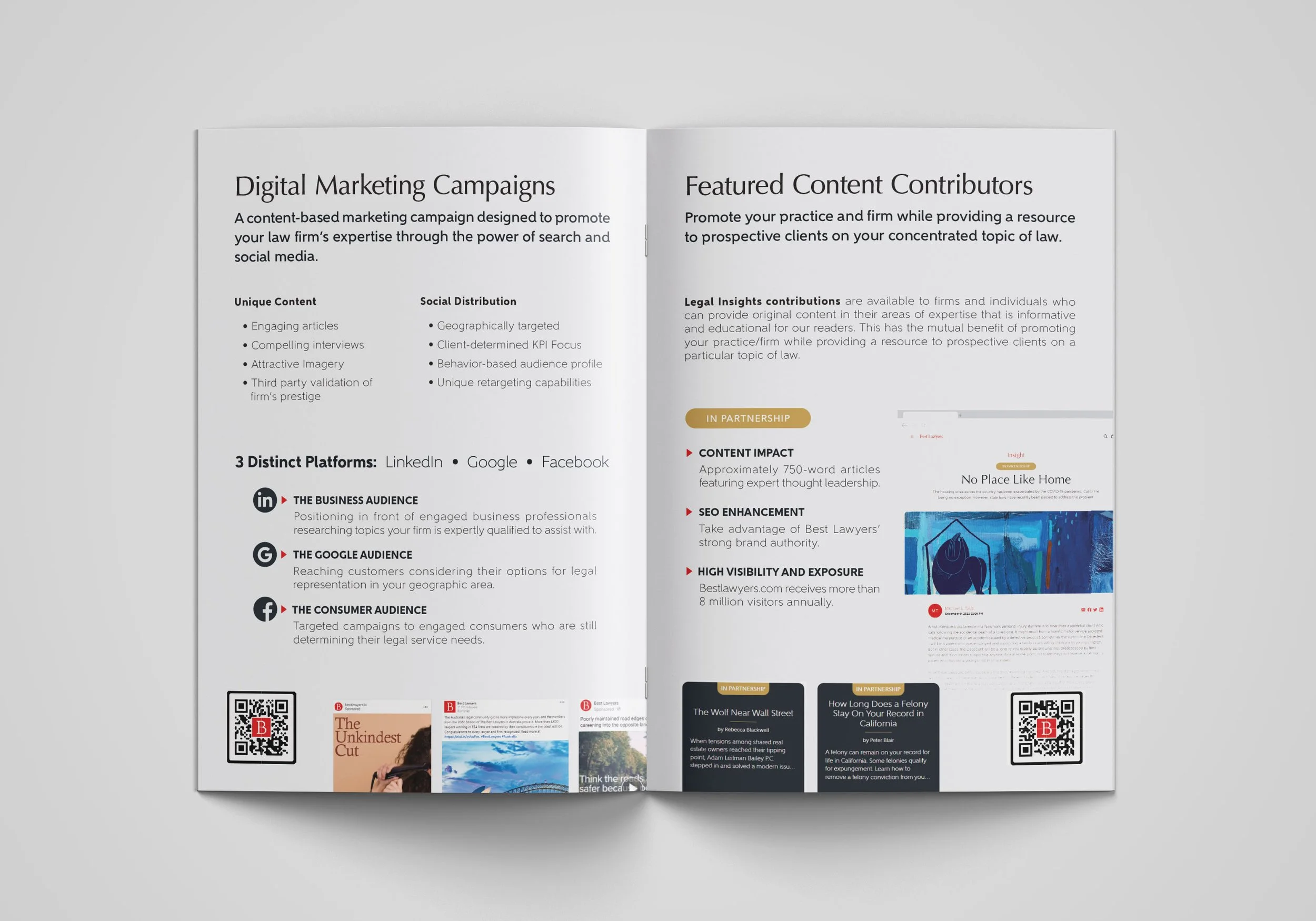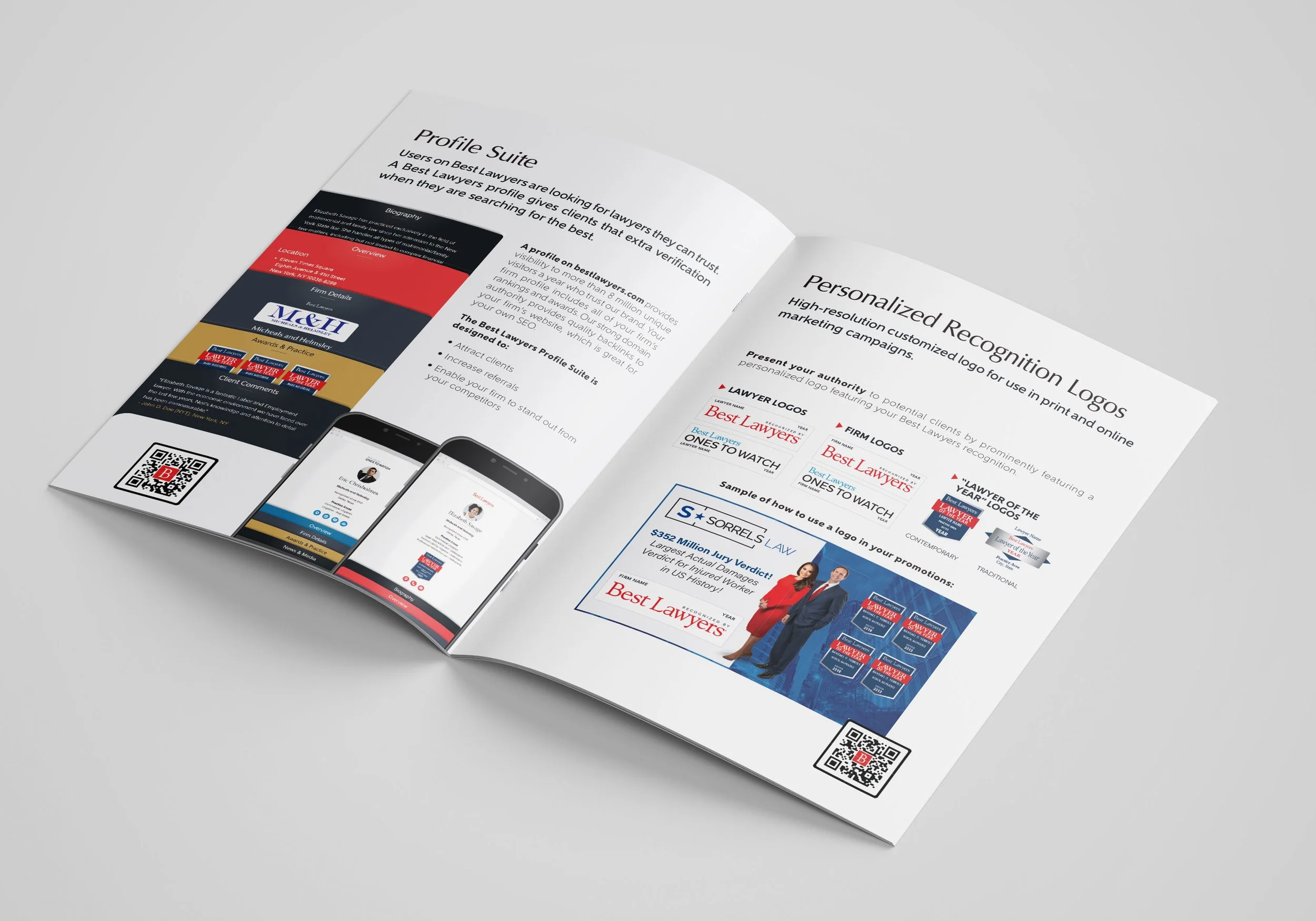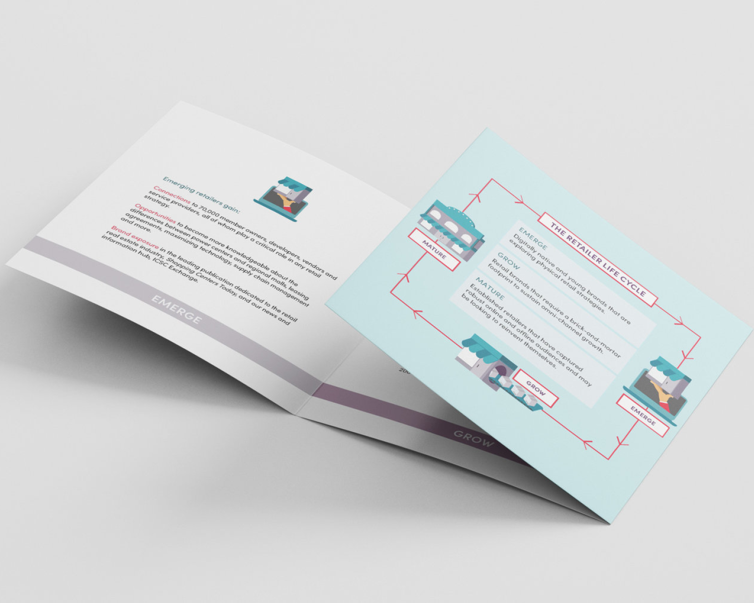 Promotional sales booklet for Best Lawyers at LMA Conference, and foldable brochure for ICSC’s “Retail in Focus” spotlight at RECon Convention.